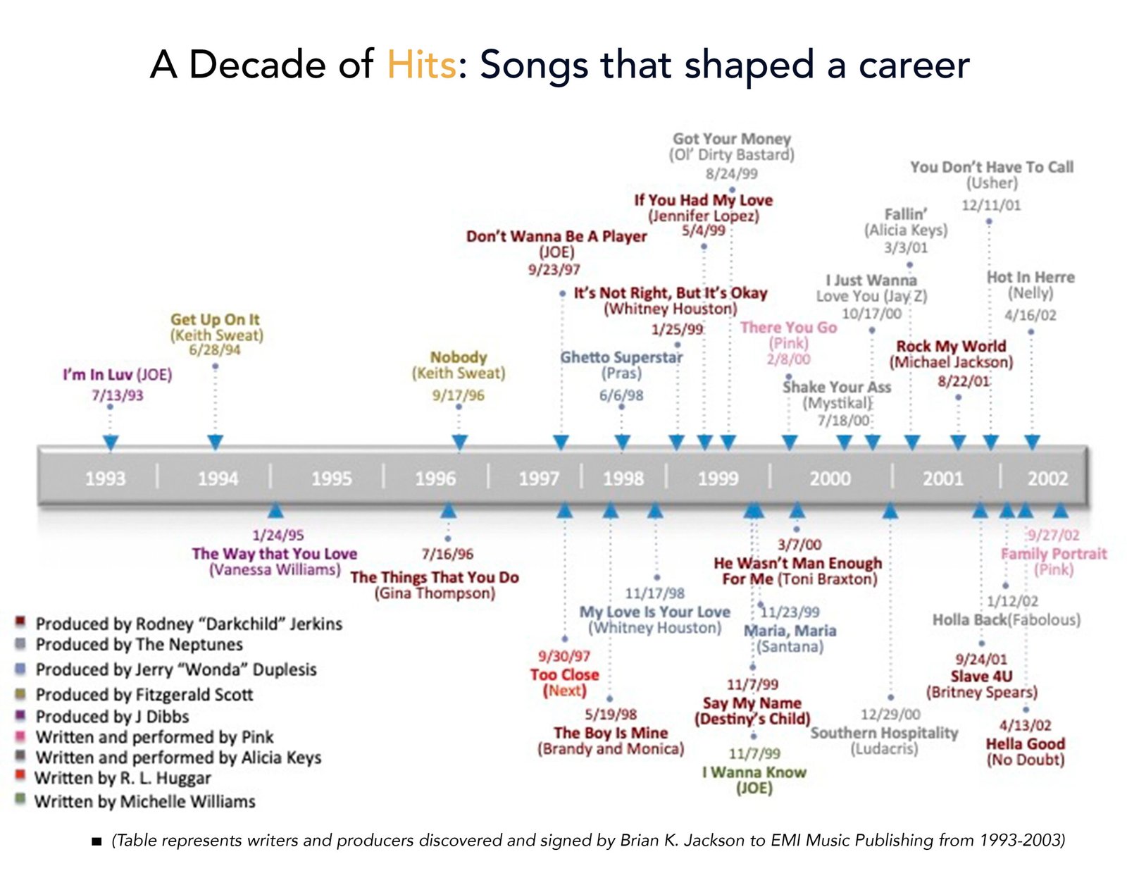 Discovered and signed music icons P!nk, Pharrell, The Neptunes, Alicia Keys, Rodney “Darkchild” Jerkins, and Harmony “H-Money” Samuels